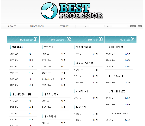 이 사이트 내에는 학년별, 과목별 교수를 소개하며, 해당 교수에 대한 <강의실력>, <도움>, <난이도>라는 항목을 분리하여 10점 만점의 수치화된 점수와 댓글 시스템을 이용하고 있다. 또, 평가 입력의 경우 별도의 로그인 절차 없이 해당 평가에 대한 닉네임과 그에 대한 비밀번호만 입력하면 된다.