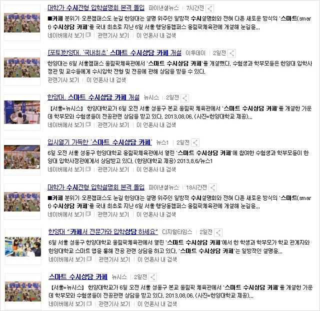 | ▲ 8월 6일 <연합뉴스> '한양대, 스마트 수시상담 카페 개설해' 기사 | ||