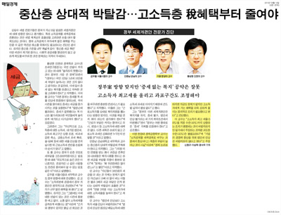 정부는 지난 8일 세제개편안을 발표했습니다. 8월 12일 <매일경제>에는 전문가가 진단하는 '정부 세제개편안'이 실렸는데요. 이영 한양대 경제금융학부 교수는 "고소득자 최고 세율(38%)을 적정 수준(40%)까지 상향하는 조치가 병행되는 것이 바람직하지만 과도한 수준(45%)은 불필요하다"고 말했습니다. 이어 그는 "기업 경쟁력 향상을 위해 법인세 인상은 바람직하지 않다"고 주장했습니다.