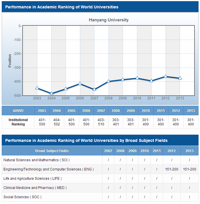 16일 중국 상하이 자오퉁 대학은 홈페이지를 (http://www.arwu.org)를 통해 '2013년 세계대학순위(ARWVU)'를 발표했다. 세계 1위는 미국의 하버드대가 차지했으며 국내에서는 서울대가 유일하게 100위권(101~150위)에 들어섰다. 100위권 이내에 국내 대학은 없다. 한양대는 300위권(301~400위)에 이름을 올렸다.