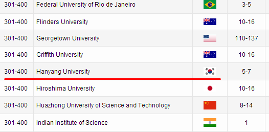 한양대학교는 2008년도에 300위권에 진입한 이후 점진적으로 상승하면서 이 범위 내에서 유지하고 있는 것으로 확인되며, 국내 순위는 5~7위로 표시가 되어 있다.