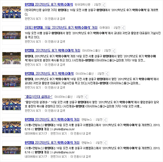 지난 16일 오전 한양대 서울캠퍼스에서 열린 '2012학년도 후기 학위수여식' 모습이 같은 날 <한국대학신문>, <이투데이>, <연합뉴스> 등 온라인 뉴스에 실렸습니다.