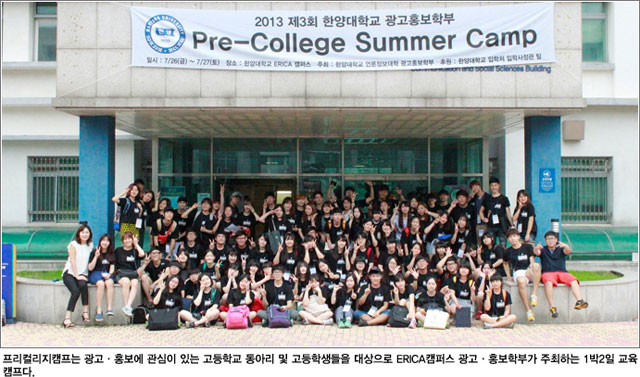 Pre-College Summer Camp(이하 프리컬리지 캠프)는 광고·홍보에 관심이 있는 고등학교 동아리 및 고등학생들을 대상으로 ERICA캠퍼스 광고·홍보학부가 주최하는 1박2일 교육캠프다. 프리컬리지 캠프는 현직 광고·홍보업계에 종사하고 있는 졸업생들의 강의, 미니 공모전, 교수진 및 재학생들과의 만남, 레크리에이션 등으로 구성된다.