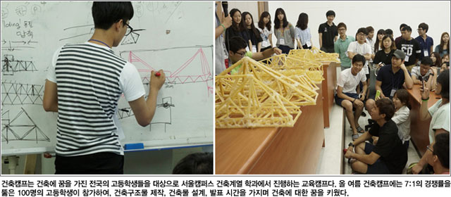 건축캠프는 건축 및 건축공학에 꿈을 가진 전국의 고등학교 재학생들을 대상으로 서울캠퍼스 건축계열 학과에서 진행하는 교육캠프다. 건축캠프에서는 건축구조에 관한 교육 및 실습, 설계 디자인 및 모델 제작을 통해 건축에 대한 교육을 진행한다. 7월 30일부터 8월 1일까지 2박3일간 진행된 이번 건축캠프에는 100명의 고등학생이 참여했다. 이들은 캠프에 참가하기 위해서 7:1의 경쟁률을 뚫고 선발된 쟁쟁한 예비 건축학도들이다. 또한 35명의 건축학부 학생들이 참가하여 캠프에 참가한 고등학생들의 멘토가 되었다.