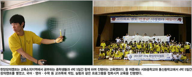 한양창의캠프는 교육소외지역에서 공부하는 중학생들에게 공부의 흥미를 주기 위해 봉사단원들이 4박5일간 진행하는 교육캠프다. 한양창의캠프 봉사단은 국어, 영어, 수학, 역사, 과학, 체육 등 학교 교육과목에 게임과 실험 등의 프로그램을 접목시켜 ‘교과서에서 배울 수 없는’ 창의적인 교육을 시행한다. 올 여름에는 강원도 인제군 서화중학교에 25명, 전라북도 군산시 동산중학교에는 22명, 총 47명의 봉사단원이 파견됐다. 봉사단원들은 7월 29일 월요일부터 8월 2일 금요일까지, 4박 5일간 교육 프로그램을 진행했다.
