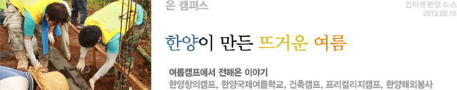 올해 한양에서는 다양한 여름캠프가 진행됐다. 여름캠프를 통해 우리대학 학생들은 교육소외지역에서 공부하는 중학생들의 교육을 돕거나, 대학의 전공 공부를 미리 체험해보고 싶은 고등학생들에게 미리 대학을 경험해볼 수 있는 기회를 제공했다. 한양창의캠프, 한양국제여름학교, 건축캠프, 프리컬리지캠프, 한양해외봉사 등은 7, 8월 달력을 빼곡하게 채웠다. 한양이 만들어낸 뜨거운 여름, 그 주인공들이 전해주는 여름캠프 이야기를 인터넷한양이 전한다.