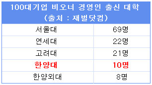 26일 재벌닷컴이 2013년 6월 말 기준 국내 100대 기업 재직 중인 사장급 비오너 경영인 163명에 대한 재직 정보를 비롯한 신상 정보를 분석해 발표했다. 이에 따르면 한양대는 이들 163명 중 10명이 해당해 서울대(69명), 연세대(22명), 고려대(21명)에 이어 4번째로 많은 임원을 배출한 학교로 나타났다.