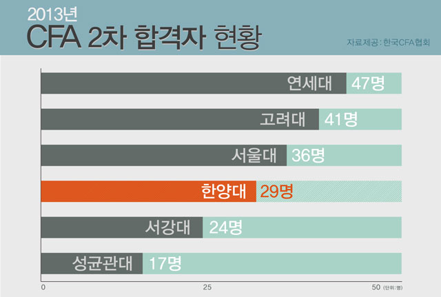 CAF(공인재무분석사)한국협회가 지난 6월 실시한 2013년 CFA 시험 합격자들의 학교 정보를 27일 공식적으로 발표했다. 이에 따르면 한양대는 2013년 2차 시험 합격생이 29명으로 연세대(47명), 고려대(41명), 서울대(36명)에 이어 4위다.