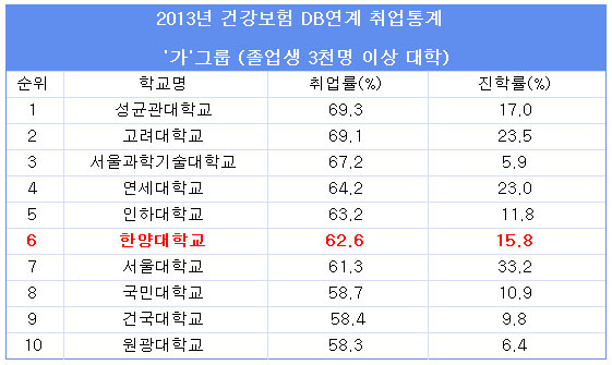 한양대가 속한 '가'그룹 취업률은 성균관대(취업률 69.3%)가 가장 높았으며, 이어 고려대(69.1), 서울과학기술대(67.2), 연세대(64.2), 인하대(63.2), 한양대(62.6), 서울대(61.3)의 순이다.