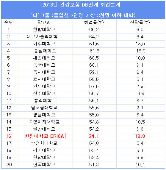 | ▲ 2013년 건강보험 DB연계 취업통계'나'그룹 (졸업생 2천명 이상 3천명 이하 대학) 출처 : 교육부 '2013년 고등교육기관 졸업자 건강보험DB연계 취업통계' | ||