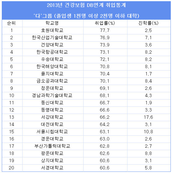 | ▲ 2013년 건강보험 DB연계 취업통계'다'그룹 (졸업생 1천명 이상 2천명 이하 대학) 출처 : 교육부 '2013년 고등교육기관 졸업자 건강보험DB연계 취업통계' | ||