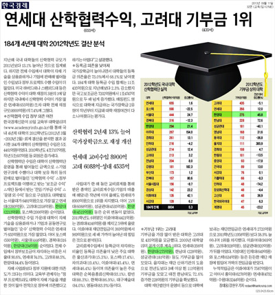 9월 11일 <한국경제>에는 184개 4년제 대학 2012학년도 결산 분석 순위가 공개됐습니다. 2012학년도 국내 대학 산학협력단 실적을 보면 연세대가 655억원으로 1위에 올랐는데요. 이어 포스텍(590억원), 서울대(444억원)순으로 이어졌습니다. 한양대는 지난해 대비 21.4% 오른 294억원 수익 실적으로 5위에 올랐습니다. 기부금 1위는 고려대로 435억원 모금했는데요. 한양대는 전년대비 45.8% 증가한 275억원을 모금해 연세대(356억원)에 이어 3위를 기록했습니다.