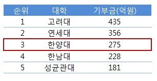 | ▲ <기부금 가장 많이 받은 대학 순위> | ||