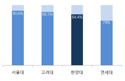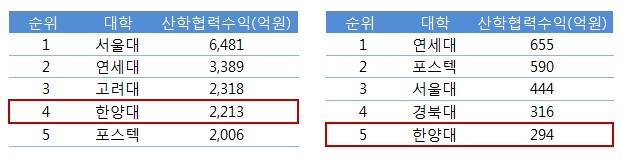 대학이 자체적으로 기술을 상용화하거나 기업과 공동연구로 수익을 올린 '순수' 산학협력 수익은 연세대(655억원), 포스텍(590억원), 서울대(444억원) 순이다. 한양대는 2011년 수익 대비 21.4% 오른 294억원을 벌어들여 184개 대학 중 5위를 기록했다.