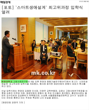 9일 한양대 종합기술연구원에서 제2기 '스마트생애설계' 최고위과정 입학식이이 열렸습니다. 이 과정은 한양대 고령사회연구원과 매일경제 은퇴경제센터가 공동으로 주관해 노후를 준비하는 이들에게 생애주기별 은퇴교육을 진행하게 되는데요. 인문교양, 강의교수기법, 지식나눔 자원봉사 프로보노, 현장견학 및 실습 등 다양한 준비 교육 과정이 포함돼 있다고 합니다. 이날 행사 소식은 9일, 11일 <매일경제>, <뉴시스> 등을 통해 전해졌습니다.