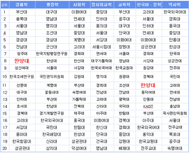 분석팀은 논문의 직접, 간접 인용 사례를 모두 확인해 학계에서의 해당 논문 영향력을 분석했다. 영향력 지수가 가장 높은 연구자를 7개 분야별로 100명씩 선정해 합산한 결과로 경제학은 부산대, 행정학은 대구대, 사회학은 이화여대, 정치외교학은 중앙대, 교육학은 부산대, 한국어ㆍ문학은 고려대, 역사학은 한국외대가 각각 1위로 매겨졌다.