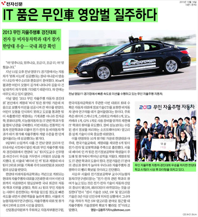 | ▲ 10월 14일 <전자신문> 'IT 품은 무인車 영암벌 질주하다' 기사 | ||