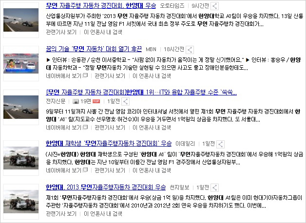 | ▲ 온라인 매체에 실린 '한양대 무인 자율주행 자동차 경진대회 우승' 기사 | ||