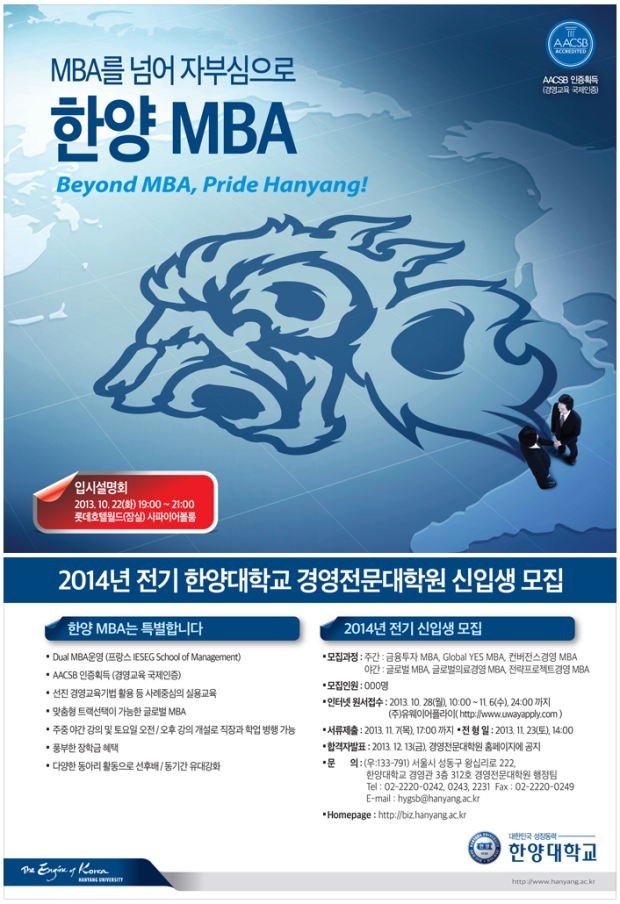 2014학년도 전기 경영전문대학원 신입생 모집 광고가 나왔다. 일반적인 모집 광고이지만, 한양대만의 색채를 가득 담고 있는 이광고는 학교의 메인 심볼인 사자마크를 중앙에 크게 넣어 눈길을 끌고 있다. 이미지 속에 대화를 하는 두 사람의 그림자가 마치 그림자인것처럼 표현된 이 그림은 세계 지도를 배경에 깔고 있어서 글로벌이라는 키워드를 떠올리게 한다. 국내에 머물지 않고 세계로 나가는 MBA만의 전략을 읽을 수 있다.