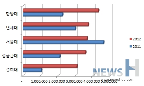 | ▲ 대학정보공시에 따르면 대학의 기술이전 수입료는 한양대가 가장 많았다. 표는 상위 5개 대학 비교 그래프. | ||