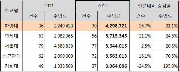교육부와 한국대학교육협의회가 지난 31일 발표한 대학정보공시 결과에 따르면 지난해 기술이전수입이 가장 많은 대학은 한양대였다. 작년에 발표된 2011년도 자료와 비교했을 때도 큰 변화가 있었다.