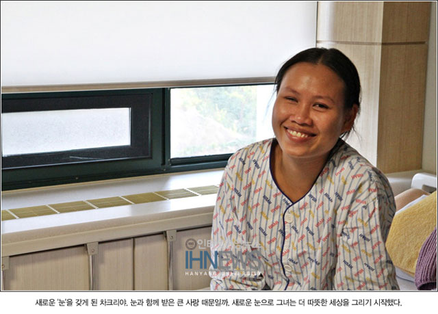 현재 성공적인 수술 후 병원에서 재활치료를 받고 있는 차끄리야. 공항에 처음 입국한 순간부터 한국의 모든 것이 그녀에게는 신기하게만 느껴졌다. 차끄리야는 “캄보디아와 비교하면 한국은 무척이나 발전되어 있다. 새로운 문화를 접할 수 있어 무척이나 기뻤고 캄보디아도 한국처럼 발전한 나라가 되었으면 좋겠다” 며 자신이 생각했던 것보다 한국이 훨씬 더 발전된 모습을 갖추고 있어 놀랐다고 말했다. 한국에 오기 전, 그녀는 자신의 상처에도 불구하고 좌절하지 않고, 언제나 매사에 최선을 다하는 학생이었다. 차끄리야는 “건강한 두 눈을 가진 다른 사람들을 보며 ‘나만 왜 이런 고통을 겪어야 하나’라는 생각에 무척이나 힘들었다. 하지만 이런 상황 속에서도 공부를 열심히 해야 더 나은 사람이 될 수 있을 것이라고 믿었다. 상처에 좌절하지 않고 언제나 매사에 최선을 다하려고 노력했다” 며 언제나 긍정적인 마음을 잃지 않았다고 고백했다.