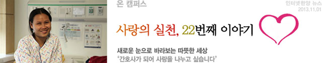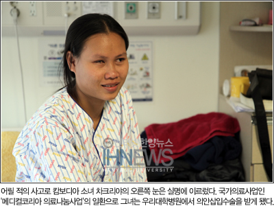 우리대학 동문사회봉사단 ‘함께한대’ 팀이 19살 소녀 차끄리야(You Chakriya)와 만난 때는 지난 7월. 캄보디아 라이프대학(Life University)을 방문한 봉사단은 운동장에서 뛰놀던 학생들 틈에서 남들과 다른 오른 눈을 가진 차끄리야를 발견했다. 어릴 적 사고로 입은 가벼운 상처였지만 초기 치료가 늦어 그녀는 실명에 이르렀다. 함께한대 봉사단과의 만남을 계기로 3달 후 차끄리야는 바다를 건너 한국에 왔다. 한국보건산업진흥원과 우리대학병원이 협력하는 ‘메디컬코리아(Medical Korea) 나눔의료사업’의 일환으로 실명된 눈 대신 의안을 삽입하는 의료혜택을 받게 되었기 때문. 훗날 백의의 천사로 일하며 자신이 받은 사랑을 나누고 싶다는 차끄리야. 새로운 눈으로 바라보는 그녀의 따뜻한 세상을 인터넷한양이 담아냈다.