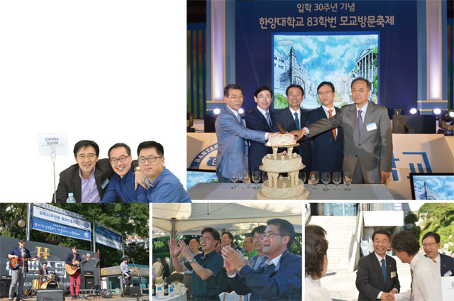 이성균(83·재료공학) 동문과 이정자(83·국어국문) 동문의 사회로 진행된 본식에서는 이번 행사를 위해 노력한 많은 동문의 소개와 함께 임덕호 총장의 환영사가 이어졌다. 임덕호 총장은 “이 자리에 계신 83학번 동문 여러분이 우리 한양의 과거이며 현재이고, 또 미래”라며 “지난 30년뿐 아니라 다가올 30년의 세월을 지금처럼 든든한 한양의 버팀목이 되어주길 부탁드린다”고 말하며 83학번 동문들에게 감사와 환영의 인사를 전했다. 총동문회 양원찬 회장은 “올해는 특별히 서울캠퍼스와 ERICA캠퍼스의 동문이 함께 어우러져 행사를 준비하고 진행하게 되었다”고 의미를 되새기며 “오늘 하루는 반복되는 일상과 쌓였던 걱정거리를 벗어던지고 오랜만에 만나는 친구들과 처음 만나는 동기들이 함께 어우러져 특별한 우애를 돈독히 다지는 시간이 되길 바란다”고 축사를 전했다. 추진위원장 윤성태(83·산업공학) 동문은 30년의 세월을 거슬러 캠퍼스에 함께해준 동기들에게 감사를 전하며 “꿈과 열정으로 가득했던 학창 시절로 돌아가 떨리는 가슴을 벗 삼아 추억을 건배하자”고 동기들에게 인사를 전했다. 이날 윤성태 추진위원장은 총장으로부터 감사패를 수여받기도 했다. 선배님들의 화합의 장을 축하하기 위해 후배를 대표해 찾아온 김현(84·사학) 동문은 “선배님들을 따라 사랑을 실천할 수 있도록 하겠다”고 축사를 건넸다. 특히 이날 있었던 83학번 장학금 수여식에서는 지난 15년간 진행된 동기 장학금 수여 금액 중 가장 큰 금액이 모금되어 큰 박수가 터져 나왔다.