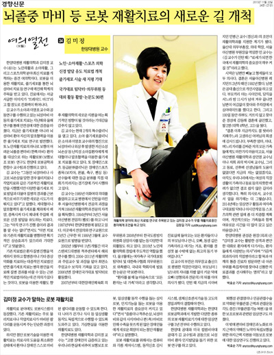 김미정 재활의학과 교수의 연구소식이 22일 <경향신문>을 통해 전해졌습니다. 김 교수는 노인재활, 소화재활, 스포츠의학 분야의 최신 치료를 개척하고 있는 여의학자로 소개됐는데요. 그는 신경마비의 근본적인 치료법이 될 수 있는 줄기세포 연구와 로봇을 이용한 재활치료 등을 연구하며 재활의학의 새로운 지평을 열고 있다고 합니다.