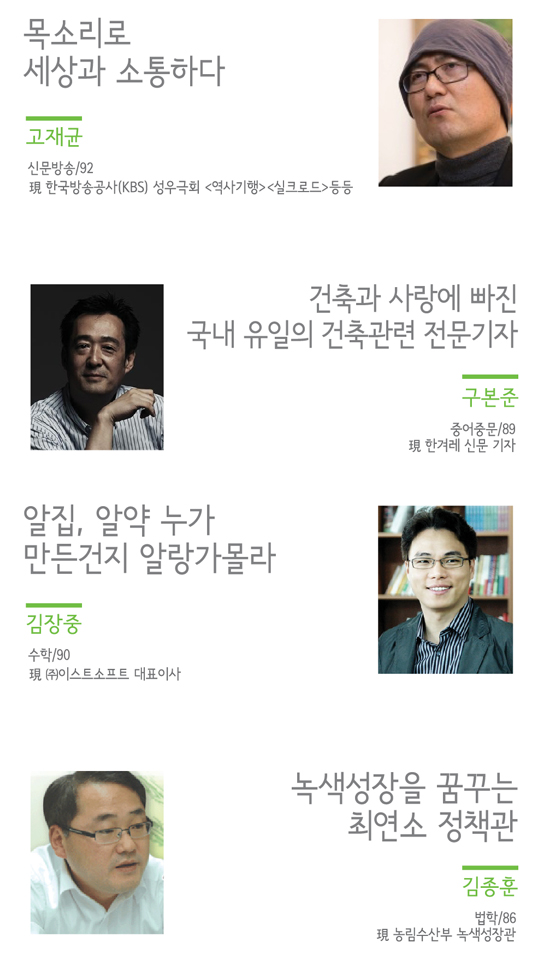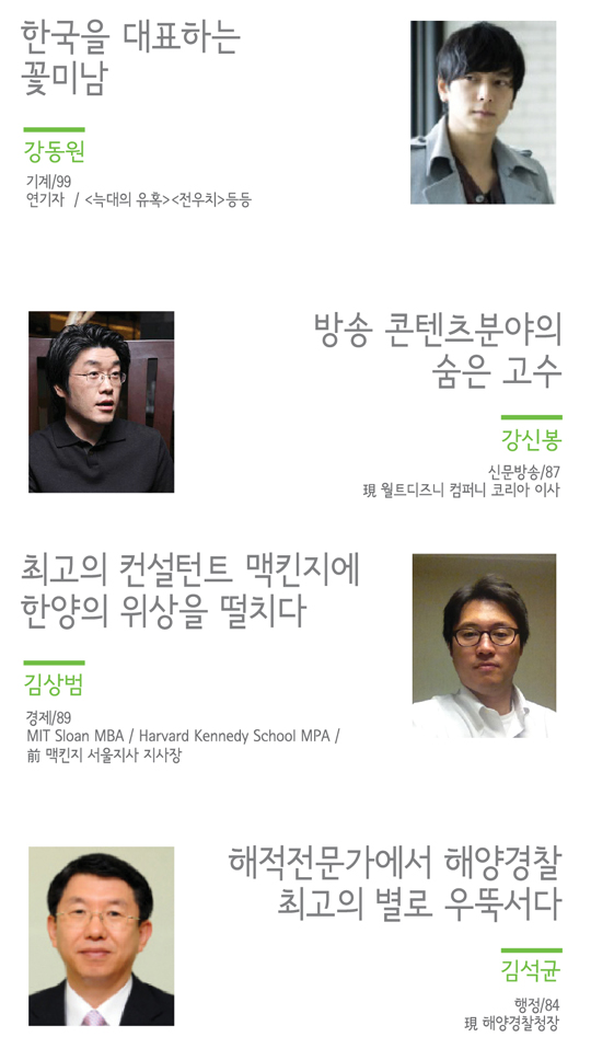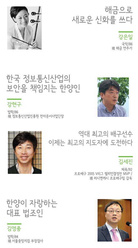 한양대 재학생들 대상으로 각자의 분야에서 인정을 받고 있는 젊은 동문들을 소개하는 "한양, 74인의 영리더를 말하다" 프로젝트를 시작합니다. 이를 위해 <한양동문 홍보주간>으로 지정한 12월 2일부터 일주일간 학교 곳곳에서 재학생들을 찾아갈 예정입니다.