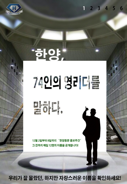 74인의 명단과 내용은 11월 26일부터 6일간 매일, 페이스북 한양대 페이지와 여기 한양뉴스포털을 통해서 12명씩 공개되며, 완료 후 전체 목록을 정리하여 공개할 예정입니다. 이어서 12월 2일부터 일주일간 '한양동문 홍보주간'을 통해 다양한 경로로 재학생들을 중심으로 홍보해나가고자 합니다. 한양인들의 많은 관심 부탁드립니다.