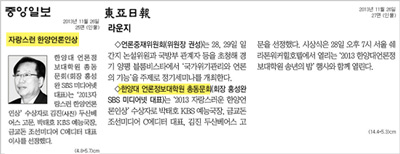 한양대 언론정보대학원 총동문회는 '2013자랑스러운 한양언론인상' 수상자를 발표했는데요. 수상자는 26일 <중앙일보>, <동아일보>를 통해 공개됐습니다. 시상식은 28일 '송년의 밤' 행사에서 진행될 예정이라고 하네요.
