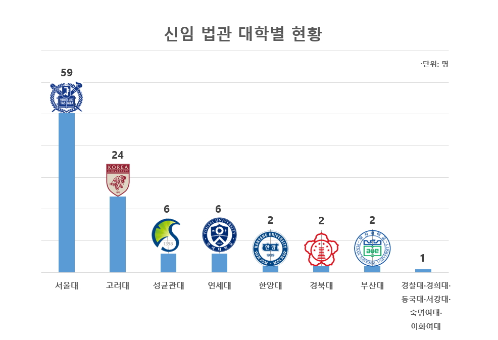 기사에 따르면, 가장 많은 신임법관을 배출해낸 대학은 서울대로 59명(55.1%)이다. 이어 고려대 24명(22.4%), 성균관대·연세대 각 6명(5.6%), 한양대·경북대·부산대 각 2명(1.9%), 경찰대·경희대·동국대·서강대·숙명여대·이화여대 각 1명(0.9%) 등으로 나타났다.
