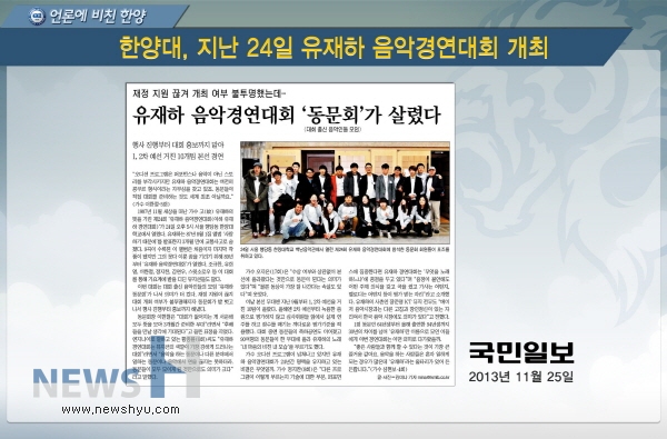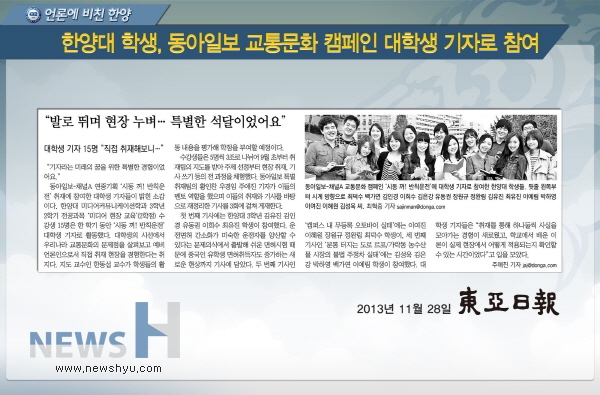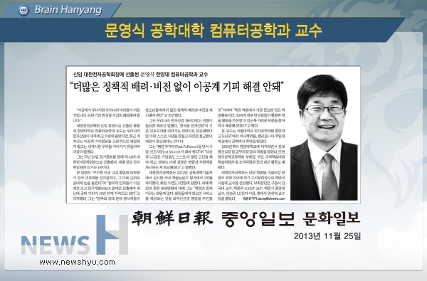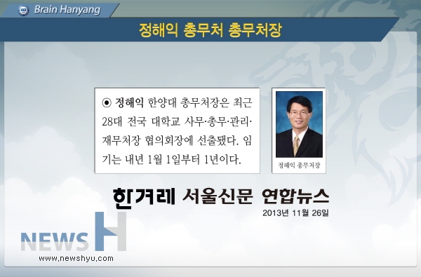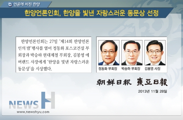 ▲ Brain Hanyang - 문영식 공학대학 컴퓨터공학과 교수 (2013. 11. 25 게재) ▲ 언론에 비친 한양 - 한양대, 지난 24일 유재하 음악경연대회 개최 (2013. 11. 25 게재) ▲ Brain Hanyang - 정해익 총무처 총무처장 (2013. 11. 26 게재) ▲ 언론에 비친 한양 - 한양대 학생, 동아일보 교통문화 캠페인 대학생 기자로 참여 (2013. 11. 28 게재) ▲ 언론에 비친 한양 - 한양언론인회, 한양을 빛낸 자랑스러운 동문상 선정