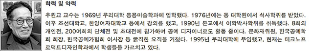 “멀리 보고 돌을 던져라.” 42년 공예의 길을 걸어온 추원교 교수가 후배이자 제자들에게 던지는 한 마디다. “조그만 것에 연연하지 말고 갔으면 좋겠습니다. 예술작품이라는 것은 이 시대에 각광을 받는 작품도 있지만, 죽어서 인정을 받는 작품이 더 많습니다. 저는 후배와 제자들이 사후에 훌륭하게 평가 받을 수 있는 작품을 만들었으면 좋겠습니다. 또, 자신의 꿈이 올바르다고 생각하면, 어렵더라도 꾹 참고 길을 걸었으면 좋겠어요. 어렵다고 돌아갔던 길을 훗날 후회할 수도 있으니까요. 어려운 길이라도 꿋꿋하게 잘 이기고 나갔으면 좋겠습니다. 그래야 후회 없는 인생 살아요. 비굴하지 말고, 당당하게 살기를 바랍니다.”