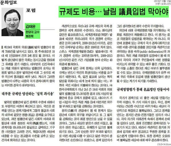 국회에서 발의되는 법률안에 대해 규제만 양산하는 ‘실적 과시용’이라는 우려의 목소리가 높아지고 있습니다. 김태윤 교수는 12월 13일자 문화일보 기고글에서 “의안에 포함돼 있는 규제에 대해 국가 경제사회적으로 영향이 있는지 파악하는 규제영향평가가 도입되어야 한다.”고 말했습니다. 이를 통해 객관적인 증거와 자료에 입각해 정교하고 투명한 정책을 만들어야 한다고 말했습니다.
