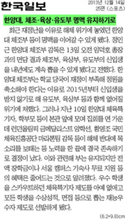 지난 13일 한양대학교는 체조ㆍ육상ㆍ유도부 폐지 문제로 이에 반대하는 동문과 학부모 대표와 면담을 가졌습니다. 그 결과 해체 반대의 목소리를 받아들여 계속 신입생을 받기로 결정하였는데요. 이에 따라 부는 유지되지만 학교의 지원규모와 종목별 모집인원이 변경될 예정이라고 하네요.
