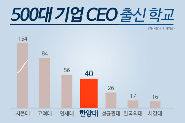 시사주간지 <시사저널> 12월 18일 자 (1261호)에 500대 기업 최고경영자 분석 자료가 실렸다. 총 651명 중, 학력이 파악된 608명을 분석한 결과 한양대 출신은 40명으로 4번째로 많은 수를 배출한 것으로 나타났다.