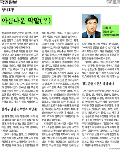 16일 <국민일보>에는 정치인들의 변화를 촉구하는 김정기 신문방송학과 교수의 기고글이 실렸습니다. 김수영 시인의 ‘시여, 침을 뱉어라’, 백남준 선생의 ‘예술은 사기’라는 아름다운 막말(?)에 비유하며 정치인들에게 이 같은 소통 리더십을 촉구했는데요. 김 교수는 “포용적인 정치 리더십, 소통 리더십이 절실히 요구되는 상황이다. 새해에는 국민을 즐겁게도 하고 숙연케도 하는 정치인들의 아름다운 막말을 요청한다”고 말했습니다.