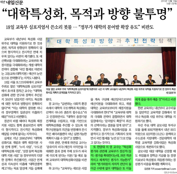 교육부가 대학지원을 특성화 사업 위주로 진행하기로 한 것과 관련하여 ‘대학특성화 심포지엄’이 열렸는데요. 대학특성화의 목적과 방향성에 대한 쓴소리가 쏟아졌습니다. 심포지엄에 참석한 경제금융대학 이영 교수는 “특성화 평가와 관련해 교육부가 정성적 평가를 확대한다는데, 과연 객관적이고 체계적인 평가가 가능한가”라며 비판했습니다. 또한 “평가의원의 자의적 판단이 들어갈 수밖에 없어 대학들은 또 이들에게 줄을 대려 애쓸 것”이라고 지적했습니다.