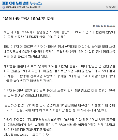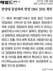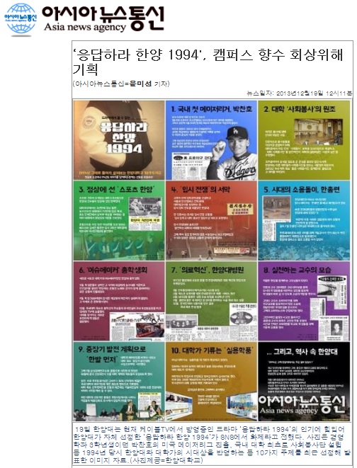 요즘 드라마 '응답하라 1994', 일명 응사의 인기가 꾸준히 치솟고 있는데요. 한양의 1994년을 되짚어보기 위해 기획한 '응답하라 한양 1994' 또한 SNS에서 큰 인기를 얻고 있다는 소식이 <헤럴드경제> , <파이낸셜뉴스>, <아시아뉴스통신> 등을 통해 전해졌습니다. 1994년에 있었던 박찬호 선수의 미국 메이저리그 진출, 국내대학 최초로 사회봉사단 설립 등 한양대의 시대상을 반영한 10가지 주제를 모아 페이스북을 통해 공개한 것인데요. 페이스북에서 3일간 16만 명에게 노출되는 등 재학생은 물론 예비 한양인에서부터 동문까지 그 인기가 빠르게 확산되고 있다고 합니다.