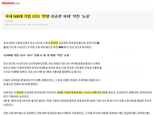 시사주간지 시사저널은 최근 우리나라를 이끌고 있는 국내 500대 기업 CEO 608명의 학력을 분석하였는데요. 그 결과 608명 가운데 한양대 출신 CEO는 40명으로 4위에 오르는 큰 성과를 냈다고 합니다. 한양대 뒤를 이어 약진을 보인 성균관대(5위), 외대(6위) 출신과 합치면 CEO 8명 중 1명은 이 3개 대학 출신이라고 하니, 한양대 동문들의 활약이 눈길을 끄는 결과네요.