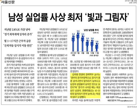 지난달 남성 실업률이 2.8%로 사상 최저를 기록했는데요. 김재원 경제학부 교수는 "정부의 경기부양책으로 경기가 점점 살아나면서 일자리가 늘어나고 남성의 실업률이 낮아진 것으로 보인다"며, "경기가 나아질 때는 여성보다 남성이, 연령대별로는 40, 50대의 일자리가 먼저 늘어나는 특징이 있다"고 말했습니다. 하지만 취업자가 늘어나는 반면 단기간 근무자나 임시직 일자리가 늘어나는 것으로 보아 일자리의 질도 좋아졌다고 할 수는 없다고 합니다.