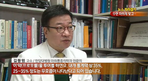 한양대학교 마취통증의학과 김동원 교수는 KBS와의 인터뷰에서 "이 약(프로포폴)을 투여를 하면요. 대개 통계학 상 35% 정도는 무호흡이 나타난다고 되어 있습니다. 숨을 안쉬는 것이죠. 숨을 못 쉰다는 이야기는 모든 조직에 산소 공급이 안 되는 것이죠" 라고 말했습니다.