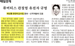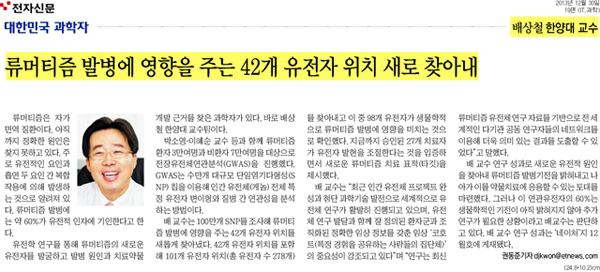 한양대 류마티스병원 교수팀이 최근 대규모 공동연구로 마티스 관절염의 새로운 유전자를 발굴해 내고, 이를 통해 발병기전 및 치료약물 개발 근거를 찾아내 화제가 되고 있습니다. 방소영, 이혜순, 배상철 교수팀의 연구 결과에 따르면, 이번 새롭게 발굴한 42개의 유전자 좌위(loci)를 포함해 현재까지 류마티스 관절염의 101개 유전자 좌위(loci) 즉 총 378개의 유전자가 발굴됐으며, 이들 중 98개의 유전자는 생물학적으로 발병 기전에 크게 기여함을 밝혀냈다고 합니다.
