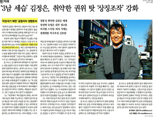 저서 ‘극장국가 북한’으로 화제를 모았던 정병호 문화인류학과 교수가 향후 김정은의 행보를 예측했는데요. 정 교수는 “북한의 제1비서는 장남이 아닌 3남 세습을 했고 내세울 경력이나 투쟁 경험도 없습니다. 이 때문에 권력 강화를 위해 앞으로도 상징 조작 등에 매달릴 가능성이 높습니다”고 말했습니다. 또한 장성택 전 노동당 행정부장의 처형 이후 김정은 제1비서는 ‘극장국가’를 강화하는 방향으로 갈 수밖에 없을 것이라고 내다봤습니다.