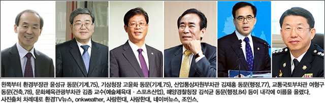새로 출범한 박근혜 정부에서 환경부 장관에 윤성규 동문(기계.75), 산업통상자원부차관에 김재홍 동문(행정.77), 교통국토부 차관에 여형구 동문(건축.78), 문화체육관광부 차관에 김종 교수(예술체육대·스포츠산업), 해양경찰청장에 김석균 동문(행정.84) 등이 내각에 이름을 올렸다.