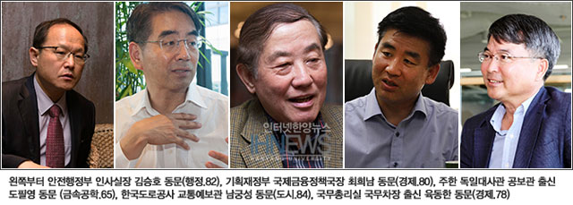 공직엔 이미 한양인이 많다. 나라를 위해 일한다는 사명감으로 애국의 중심에 서있다. 올해 인터넷한양은 총 5명의 공직자를 만났다. 한국도로공사에서 대학교교통연구실장과 명절교통예보관으로 활동하는 남궁성 동문(도시.84), 국무총리실 국무차장을 지낸 육동한 동문(경제.78), 기획재정부 국제금육정책국장 최희남 동문(경제.80), 안전행정부 인사실장 김승호 동문(행정.82), 41년 간 주한 독일대사관 공보관으로 지내고 올해 퇴임한 도필영 동문(금속공학.65)이 그들이다.