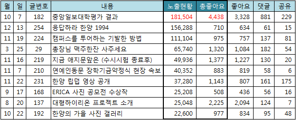 가장 많은 사람들이 본 콘텐츠는 10월 7일에 게재된 '중앙일보대학평가 결과'였다. 한양대 서울캠퍼스와 ERICA 캠퍼스 모두 약진하면서 좋은 성과를 낸 만큼 많은 사람들이 호응을 했다. 이 게시물은 18만명이 넘게 보고, 좋아요 수만4,400개를 넘어섰다. 한양대 팬수가 1만7600명 대 인걸 감안하면 매우 높은 확산도를 보여줬다.이를 통해 대학 평가 결과 즉 순위 변동에 대한 높은 관심을 엿볼 수 있었다.