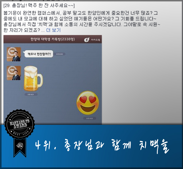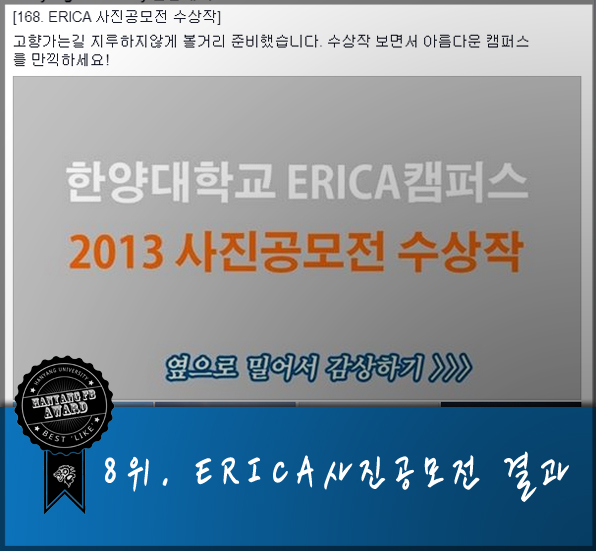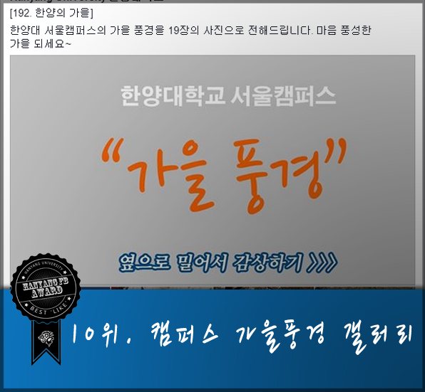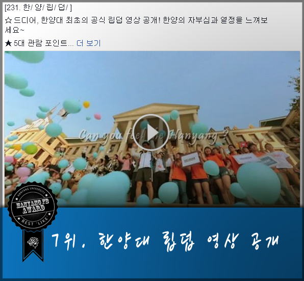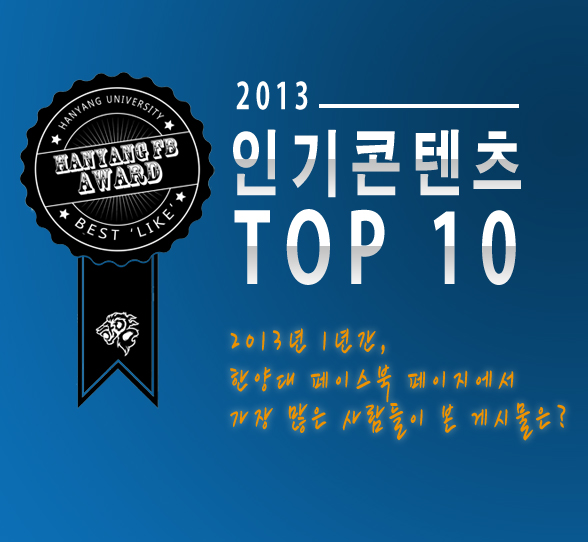 한양대학교 공식 페이스북 페이지에는 2013년 한해 동안 300개에 가까운 게시물이 게시됐다. 페이스북의 특성상 사람들이 좋아요 클릭이나 댓글, 공유를 많이 하면 할 수록 많은 사람들이 그 게시물을 보게 된다. 따라서 많은 사람들이 봤다는 뜻은 그만큼 그 콘텐츠가 인기가 있거나 많은 사람들의 공감을 얻었다는 뜻으로 이해할 수 있다. 한해 동안 가장 많은 사람들이 본 한양대 페이스북 콘텐츠는 어떤 것들이었을까. 공식적인 데이타를 가지고 정리를 해봤다. 참고로 통계 데이타는 2013년 12월 30일 기준으로 정리된 것이다.